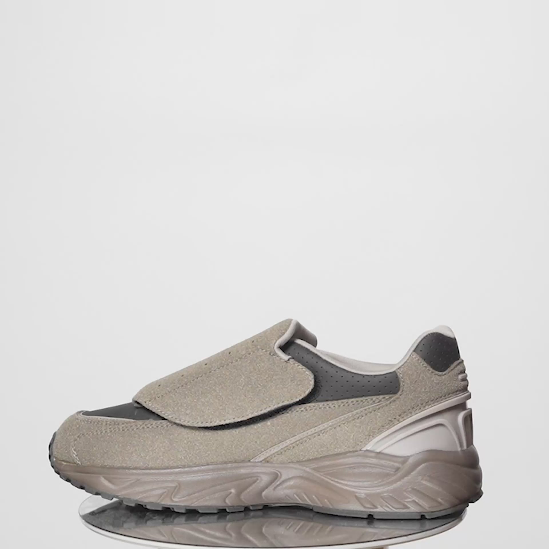 清掃業や作業場で使われるワークシューズをデイリーユースに。直線を活かしたパターン構成にアイコニックなデザインの甲バンドが特徴。作業等の負担を軽減するクッション性に優れたソールユニット、アッパー素材には手入れのしやすい合成皮革を採用。ユーティリティなバンドタイプ。