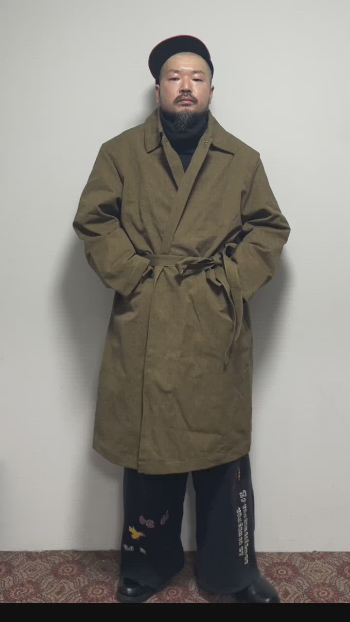 ボタンは上部の1つだけ、あとは腰部のベルトできゅっと縛るだけのシンプルなコートです。